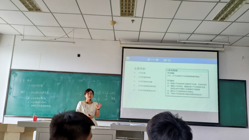 在李贞玉老师讲授的《大气污染控制工程》课程上,运用SPOC平台以及PPT讲解的线上线下混合教学模式。课前,李老师向同学们分享即将学习的优秀教学资源,方便同学们充分的预习,提高学习效率。李老师所采用的PPT板书内容精炼,主次分明,知识点罗列清晰。丰富的教学经验和实践经验使得李老师能精准把握重难点,并以问题形式引导同学们认真思考,面对学生提出的许多专业性问题,李老师耐心解答,学生积极探讨,认真学习,课堂学习氛围浓厚。