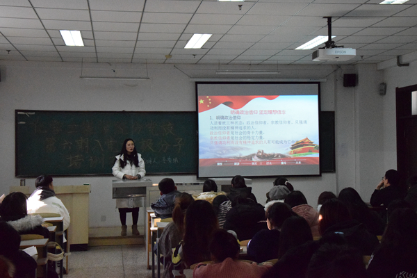本次培训班自11月26日开班以来,分别在南湖和北湖两个校区同时培训。期间学院党委书记、专职组织员、团委书记、学生党支部书记为本次培训班学员授课,授课内容涵盖了如何端正入党动机、党的基本知识、入党流程、如何对标党员标准坚定理想信念、党与共青团的关系等内容。整个培训过程中,学院分党校加强对日常出勤的考核力度,将平时考核纳入最终结业成绩的一部分;并在结业考试中进行改革,打破以往只考选择题的传统,增加填空题和简答题,加大考核难度,达到了预期效果。