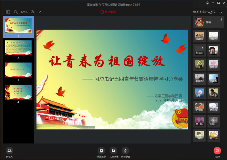分享会开始,刘香池带领全体师生回顾了习近平总书记对广大青年的五·四寄语。寄语中总书记指出:“青春由磨砺而精彩,人生因奋斗而升华。今年是决胜全面小康、决战脱贫攻坚的收官之年,也是实现‘两个一百年’奋斗目标的历史交汇之年,新时代青年要坚定理想信念、站稳人民立场、练就过硬本领、投身强国伟业。”随后,主要团学干部分享了对总书记寄语学习的心得。学院团委副书记郭一凡说:做为新时代承担中华民族伟大复兴重任的我们,要继续发扬五·四精神,努力学习,练就本领,把“青春梦”和“中国梦”紧密结合,自觉投入到社会主义现代化建设的大熔炉中,努力成为可堪大用,能担重任的社会栋梁之才。刘香池说:新时代的我们,要深入学习并传承五·四精神,要树立远大理想,热爱伟大祖国,担当时代责任,为实现中华民族的伟大复兴而努力奋斗。分享会最后,杨楠老师对同学们的发言进行了点评,对下一阶段的工作进行了布置。