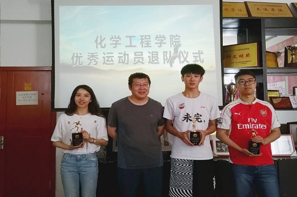 仪式中,杨楠老师首先对参加退队仪式的学院3名学生运动员进行了介绍。学院党委副书记曹永利老师为3名同学颁发了退队纪念奖杯。肖芳老师希望3名同学发扬运动场上的拼搏作风,在未来的道路上做好党员和积极分子的先锋模范作用。最后,曹永利老师讲话:“希望3名同学继续发扬化工精神,拼搏、向上、刻苦、钻研,希望在场的同学们以他们为榜样,让自己的大学生活更有意义”。