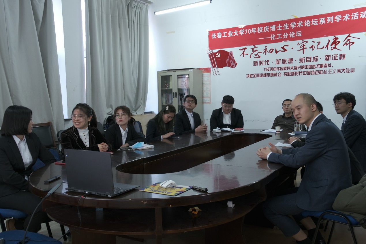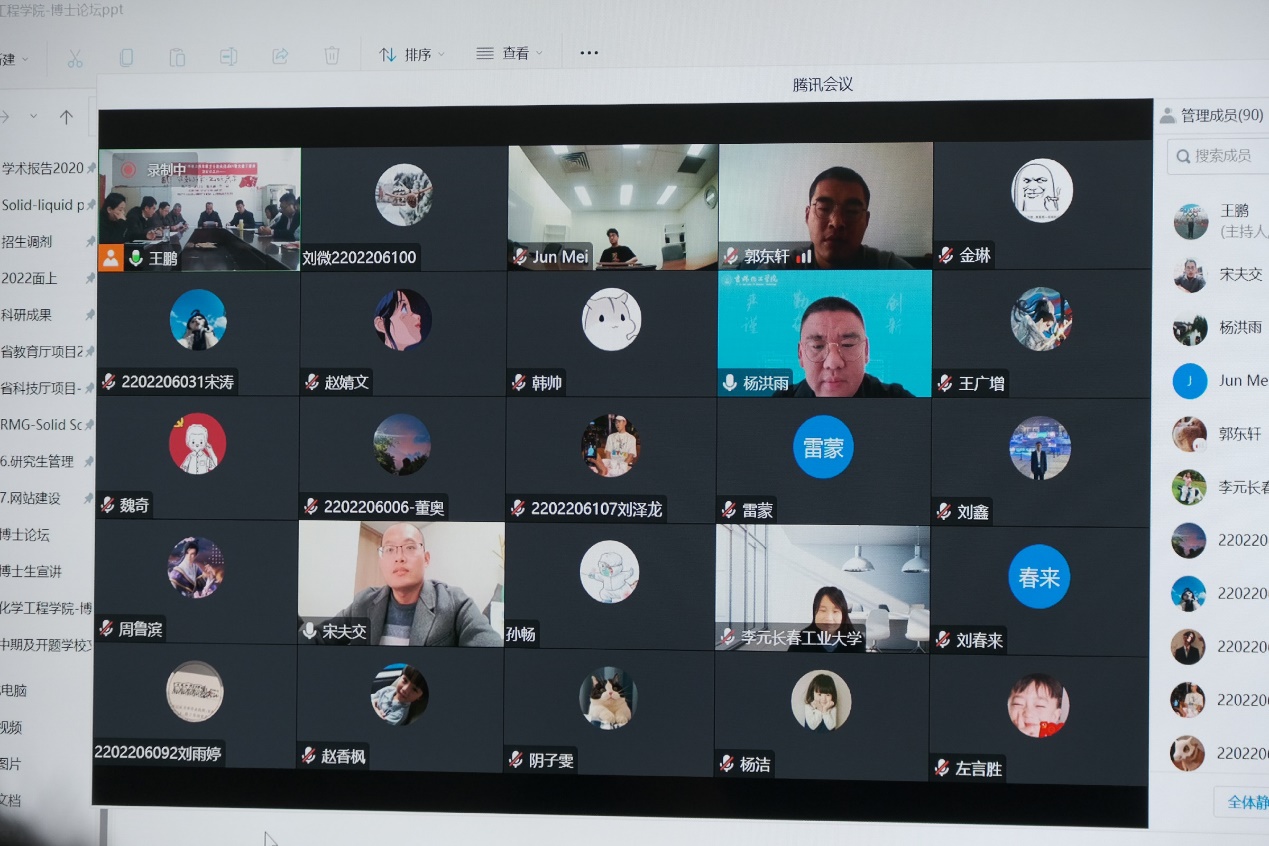 (通讯员 王鹏)为庆祝学校建校70周年,11月14日下午12:30,由研究生院、学科办、科研处主办,bv1946伟德国际始于英国承办的“校庆博士生学术论坛系列学术活动——化工分论坛”在化工楼4楼会议室及腾讯会议线上线下同步举行,会议特邀我院青年优秀校友梅俊、杨洪雨、郭东轩、宋夫交通过线上的方式为全院师生作学术报告。我院杨文龙书记、高光辉院长、张龙教授、部分系级领导以及博士生代表线下出席会议,全院师生线上参会,会议由王鹏副院长主持。