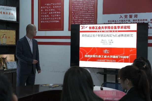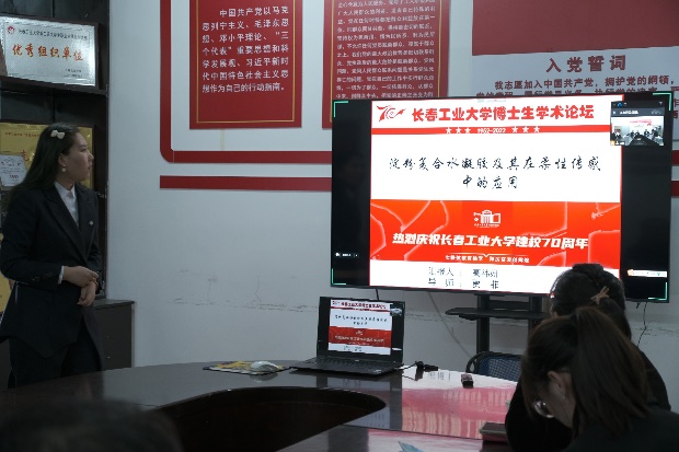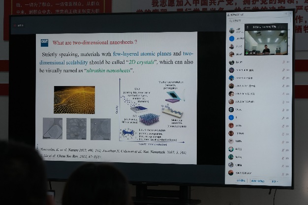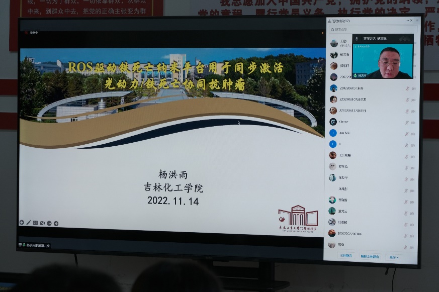 其二,由夏珊副主任主持,杨洪雨校友作了题为“活性氧驱动铁死亡纳米平台用于同步激活光动力/铁死亡协同抗肿瘤”方面的学术报告。杨洪雨,高分子材料科学与工程系青年优秀校友,1986年2月出生,教授,硕导,现任吉林化工学院材料科学与工程学院副院长,国家一流专业负责人,吉林省高校特种功能材料重点实验室主任,吉林化工学院多功能纳米生物医用高分子材料研究中心负责人。博士毕业于韩国成均馆大学(世界排名82),师从韩国科学院与工程院两院院士Doo Sung Lee教授。主要研究方向为生物可降解材料、智能纳米药物载体设计以及癌症诊断与治疗。近年来在Nanoscale,Journal of Controlled Release,Biomaterials,ACS Appl. Mater. Inter., Polymer Chemistry, Adv. Therap., J. Mater. Chem. B,等期刊发表论文30余篇,主持多项国家级、省级课题,获授权国家发明专利3项,获吉林省自然科学三等奖一项,部分科研成果实现转化。
